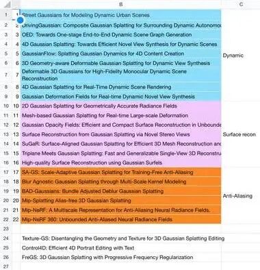 预计1个月内,完成3DGS方向经典文献的深入理解,包括论文+代码,本次研读的论文已汇总在附图2中(后续会略有更新)。每位成员完成2篇论文的解读,具体由组长与小组成员讨论后分配。