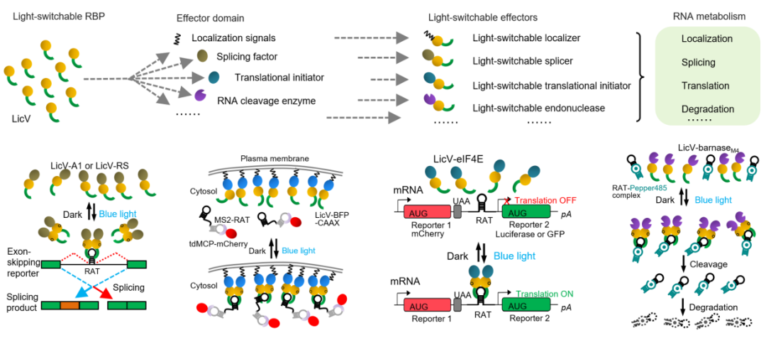 为了实现RNA结合蛋白的光遗传学控制,研究团队首先基于合成生物学理性设计并结合全新的高通量筛选策略,构建了国际上首个人工合成的光控RNA结合蛋白LicV。LicV由RNA结合结构域与LOV光敏结构域融合构成,分子量仅为23 kD。在黑暗条件,LicV是以单体形式存在,不能结合特定的RNA序列(RAT);在蓝光照射下,LicV形成同源二聚体并特异性识别结合RAT序列。研究团队随后将LicV与不同的RNA效应结构域融合,分别获得光控RNA剪接因子、光控RNA定位因子、光控RNA翻译因子以及光控RNA降解因子。他们利用这些光控RNA效应因子实现了活细胞RNA剪接、运输、翻译、降解等代谢行为的时间和空间精密控制。