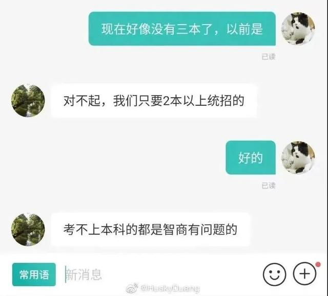据悉,当时该公司 hr 在招聘网站上称“只招收二本以上的、考不上本科的都是智商有问题”。