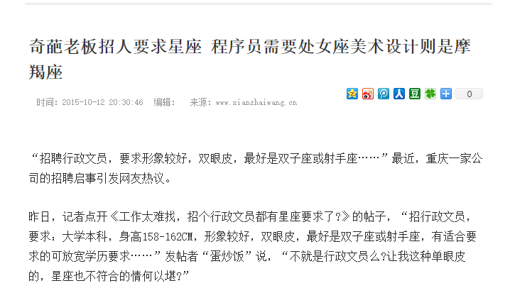 除了学历歧视,近年来,有时候求职者的星座也会被纳入公司考核标准之一。