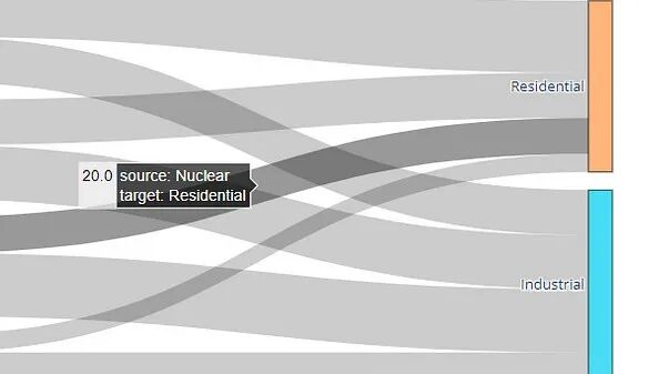 Plotly库可以用来创建如下所示的桑基图。以下代码表示能量从生产源流向小城市的消费者。