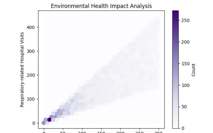 以下是一个使用Python和Matplotlib库创建六边形分箱图的示例,旨在揭示空气质量恶化(使用空气质量指数/AQI)与增加的医院就诊之间的潜在相关性。请注意,为了简化示例,我们将使用模拟数据。