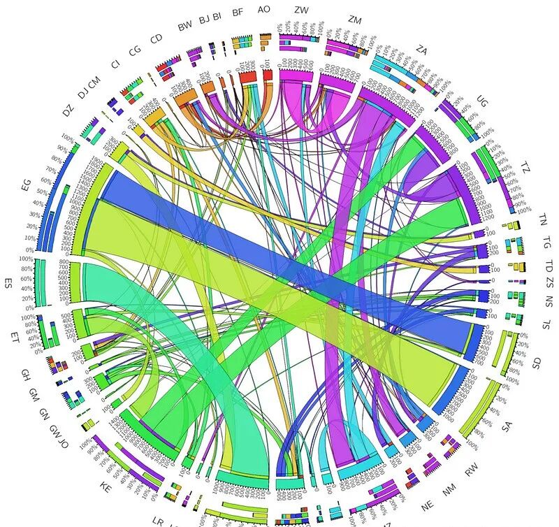 此外,和弦图还巧妙地运用了色彩这一视觉元素,将数据分门别类,使得数据的比较和区分变得直观且易于理解。这一特性使得和弦图在多个领域都有着广泛的应用,特别是在生物科学领域,它成为了可视化基因数据的得力助手。在国际学术刊物上,和弦图更是被誉为信息图表(info graphics)的典范,用于揭示社交网络的交织、基因组的奥秘、交通流的动态以及贸易关系的错综复杂。