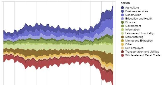主题河流图,顾名思义,其形态宛如自然界的河流,实际上它是一种独具匠心的流图设计。这种图表主要用于描绘事件或主题随时间而发生的动态变化。河流图中,不同的颜色巧妙地区分了各个类别,或用以展示每个类别的附加定量信息。而河流的流向则与横贯图表的X轴平行,清晰映射出时间的流逝。