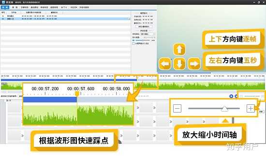 导入视频后,在主界面右上角预览框的时间进度条上,点击向下凸起的向下箭头(快捷键Ctrl+E),打开“创新式时间轴”面板,并结合“音频波形图”和“超级剪刀手”精准逐帧踩点。目前很热门的卡点视频都是配合音频波形图制作的,根据音频波形图中波峰或波谷的位置来确定要切换的画面,能很好地把握视频的节奏感。