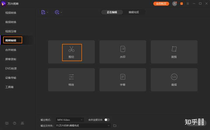 启动万兴优转,选择视频编辑功能模块,在界面中点选剪切功能,然后导入你需要进行编辑的视频。