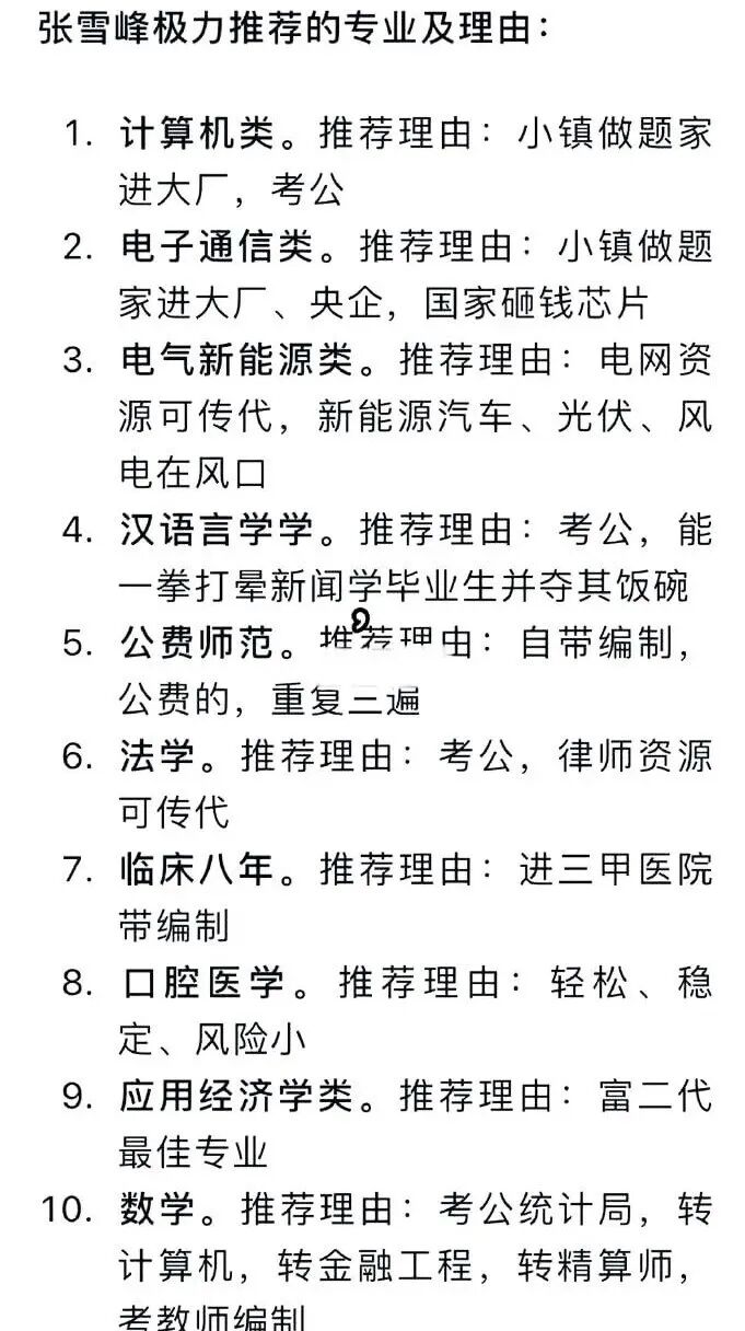 我们先来看下网友整理的,张雪峰老师对普通家庭孩子专业报考的建议: