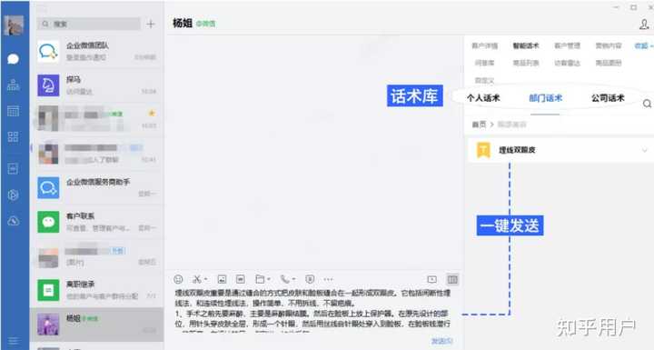 话术上传后台后,销售即可在企业微信侧边栏中进行搜索查找,一键发送客户,快速解答客户问题,提升响应效率。