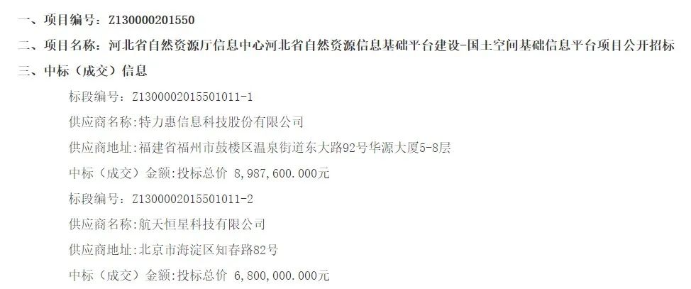 近期,继2019年河北省三调基础支撑环境建设、河北省国土资源卫星应用技术中心建设项目中标后,航天科技集团五院航天恒星公司再次中标河北省国土空间基础信息平台项目,中标额为680万元。
