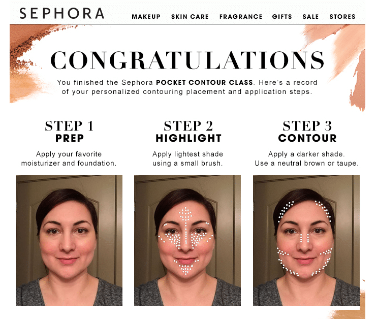 通过调研,丝芙兰发现其用户会在网络上查看产品如何使用的视频。为了让用户在线上也能获得与线下门店的体验,它在手机端推出了贴心的线上服务——Pocket Contour Class,提供美妆步骤的教程指南。用户上传自拍照后,会接收到化妆提示以及量身定制的产品推荐。