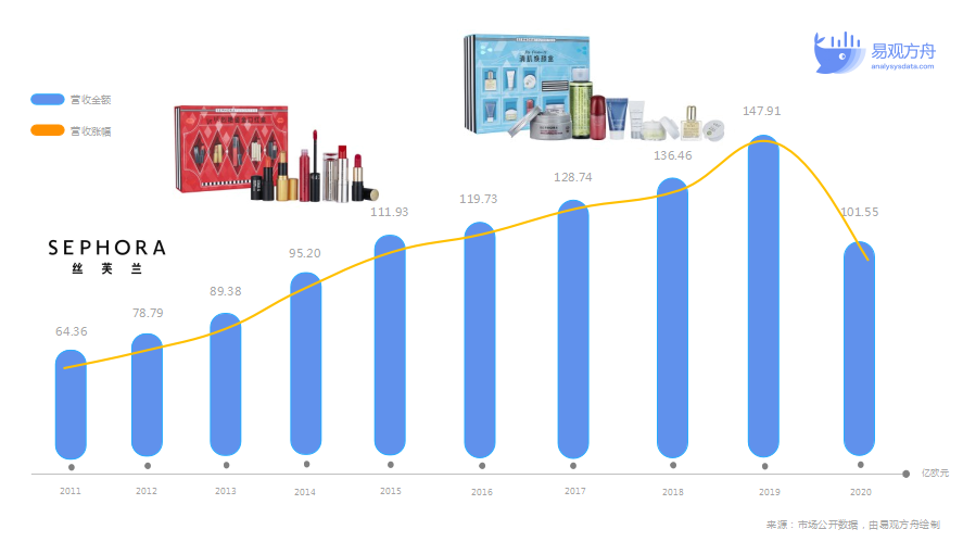 值得注意的是,由于2020年全球疫情的影响,丝芙兰的全球总营收有所下降,但丝芙兰中国的营收接近93亿。作为高端美妆零售的佼佼者,相比整个美妆市场,丝芙兰的表现依旧十分可观。