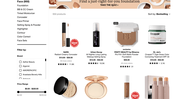 • 快速查看功能:只需单击一下,购物者就可以查看产品图片并发现有关特定商品的基本信息。丝芙兰还设计了一个调色板,并通过用 X 标记来突出显示哪些色调没有库存。