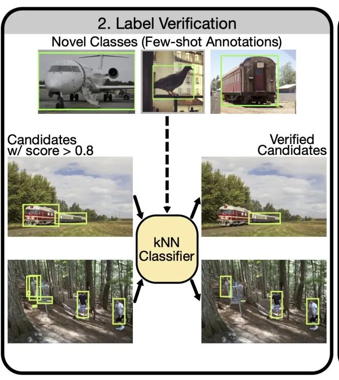 主要讲解下Label Verification!我们从Chum等人的查询扩展工作中获得灵感[Total recall: Automatic query expansion with a generative feature model for object retrieval]。它使用空间验证在检索期间接受或拒绝新实例。这里的目标是验证每个候选检测的预测类标签。具体来说,我们考虑为具有非常有限的few-shot注释的新颖类别构建分类器。仅使用少量注释构建分类器显然不是一项简单的任务,因为它通常需要高质量的特征表示。在这里,我们受益于自监督模型的最新发展,例如MoCo、SwAV、DINO,并使用这些模型产生的高质量特征构建kNN分类器。在实践中,这项工作使用了通过自监督DINO方法训练的ViT模型的输出CLS,其中NN性能被证明特别强。