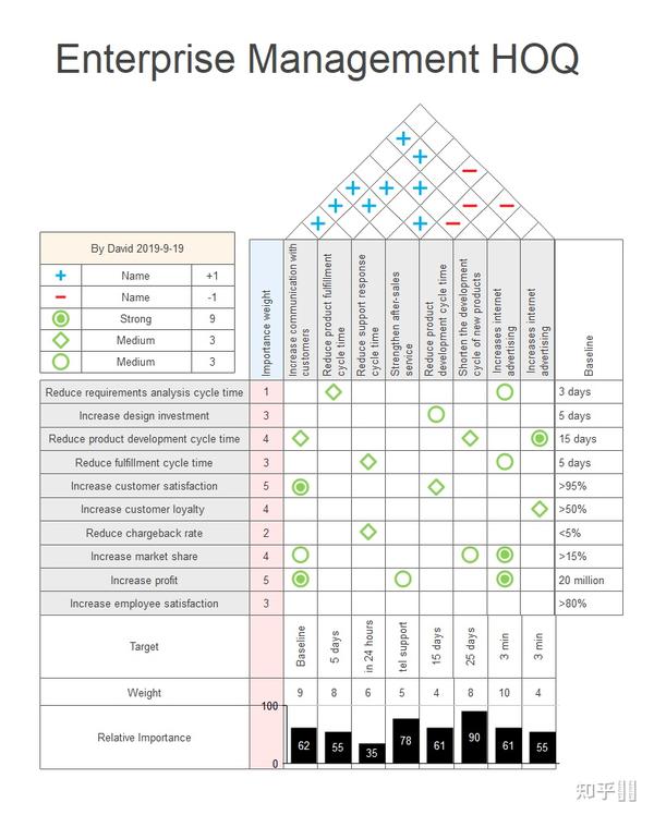 质量屋一般用于定义顾客预期和公司能力之间的关系。其构造始于分析顾客需求,写在矩阵的行里,矩阵列中是产品或服务的重量特性。矩阵中心和边缘是这组信息的关系,指导新设计的决定。