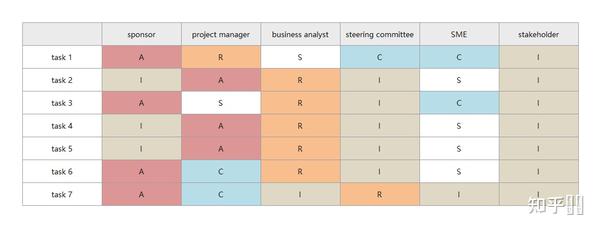R(Responsible)代表负责执行的人,A(Accountable)代表批准的人、C(Consulted)代表拥有完成项目所需的信息或能力的人员、I(Informed)代表应该被通知的人。