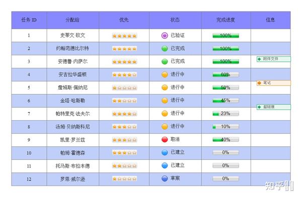 项目状态表同时包含了每个任务的执行人,项目负责人可以借此更好地评估每位员工的业绩,知道问题发生时该由谁负责。