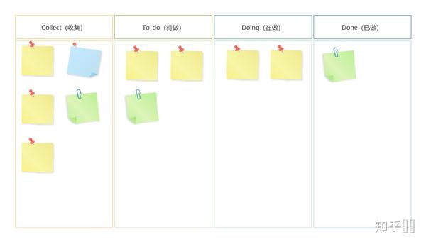 不同于甘特图,看板图不用时间轴记录项目的各个阶段,而是显示在本次迭代中要完成的所有任务的当前状态。任务用卡片(便笺纸)来代表,状态则由板上分别标有“未做(to-do)”、“正做(doing)”和“做完(done)”的三个区域来代表。