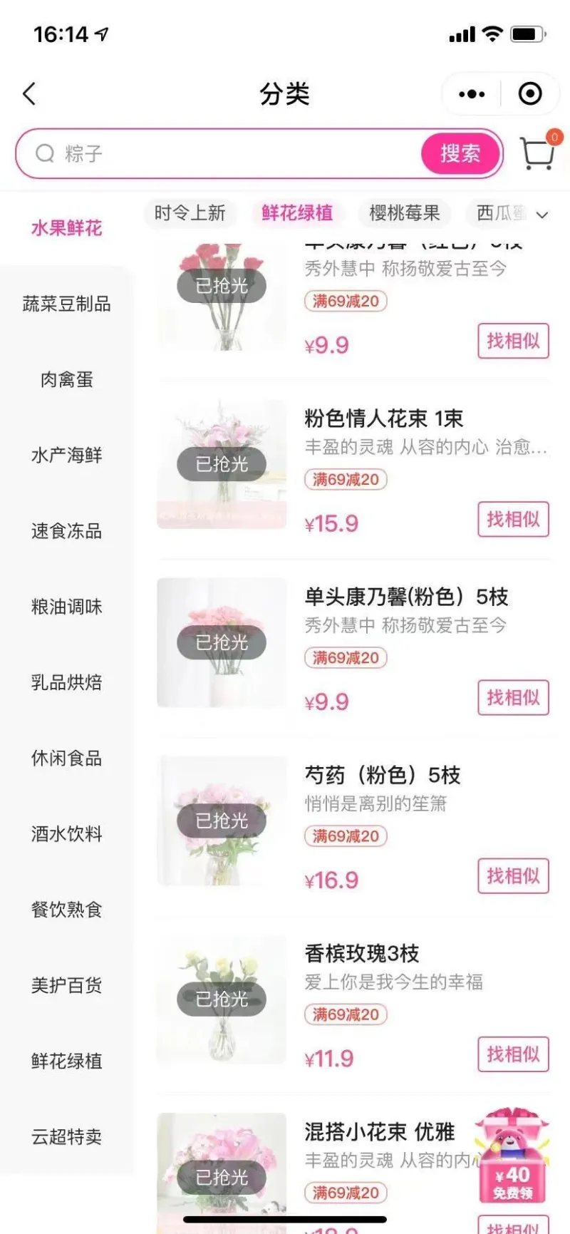 而在每日优鲜的鲜花绿植类别下,也有30多个SKU,其中有一半的SKU已经被抢光。