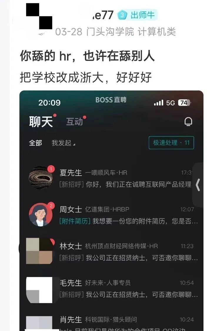 牛客上刷到这条帖子:“你添的 HR,也许在添别人”,牛友把学校改成浙大后,一大波 HR 争先恐后地“我们公司正在招贤纳士,求一份你的简历啊!”