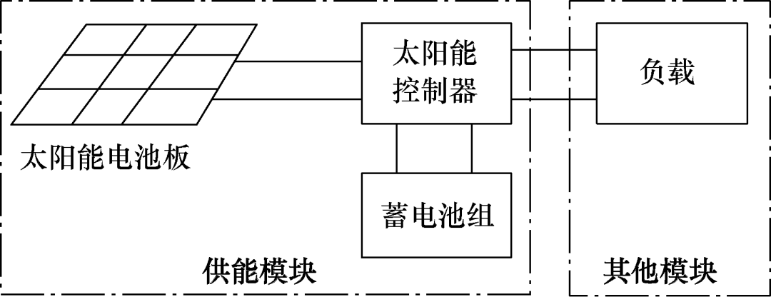 太阳能控制器对蓄电池荷电状态(state of charge, SOC)进行实时监测与管理。当蓄电池SOC>0.9时,蓄电池充电完成,并进行浮充;当蓄电池0.9≥SOC≥ 0.2时,蓄电池正常充电,进行均衡充电;当蓄电池SOC<0.2时,蓄电池进入缺电状态,断开负载电源,待蓄电池恢复正常电量后投入负载。系统供能模块如图3所示。