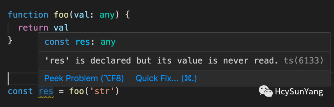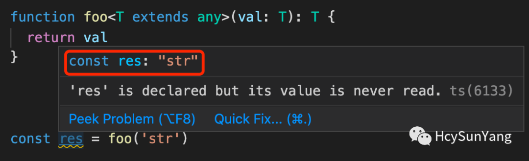 在调用 foo 函数时我们传递了一个字符串类型的参数 'str',按照之前的分析,我们得到的结果 res 的类型应该也是字符串类型,然而当我们把鼠标 hover 到 res 常量上时可以看到其类型是 any,这并不是我们想要的结果,为了达到理想状态我们只需要对 foo 函数做简单的修改即可: