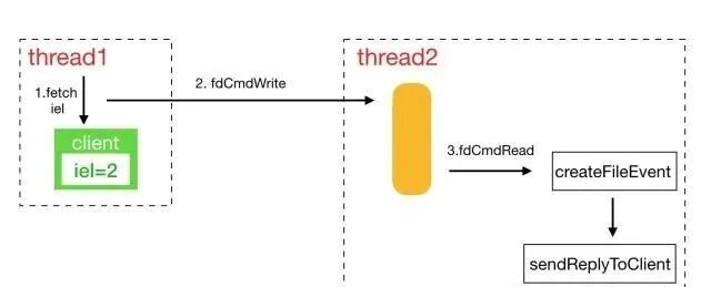 本地线程需要异步发送数据时,先检查client是否属于本地线程,非本地线程获取到client专属的线程ID,之后给专属的线程管到发送AE_ASYNC_OP::CreateFileEvent的操作,要求添加写socket事件。专属线程在处理管道消息时将对应的请求添加到写事件中,如图所示: