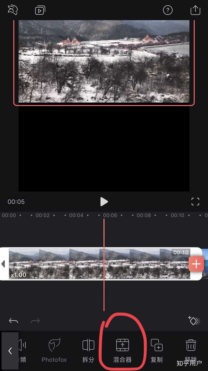 选中其中一个视频,点击“混合器”,意思是把它变成一个图层,这样你会发现视频跑到时间轴上面去了。